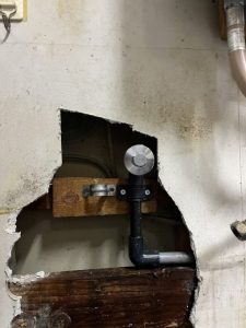 見ると壁の下がかなり濡れている状態で壁を開けさせて頂き、壁中をみたら配管より水漏れしている状態でした。