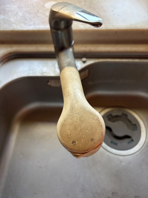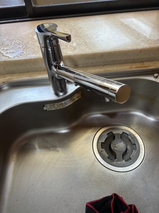 新しい蛇口はTOTOの台所蛇口になります。MYM社の蛇口と寸法などはほぼ同じですので、MYM社製からお取替えする場合にも加工無しで交換できます。
