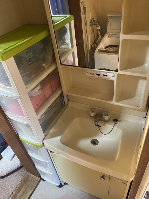 古い洗面化粧台を撤去して新しい洗面化粧台へ交換を行います。