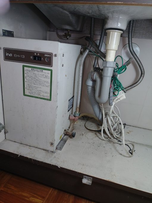 洗面台温水器の不具合が困っていることから点検を行い使用期間20年、交換部品廃盤、経年劣化状態を確認していただき、温水器と蛇口もかなり経年劣化しており交換