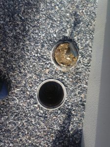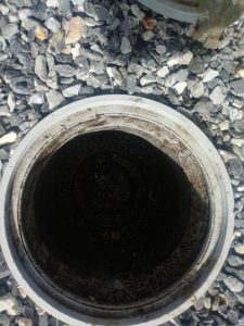 点検すると屋外の排水マスに大量の油が詰まってました。これが詰まりの原因で高圧洗浄で油詰まりを取り除きます。