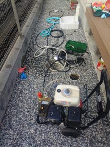 こちらの高圧洗浄機を使い、外の排水マスから屋内の台所の排水管へ洗浄ホースを入れていきます。先端は高圧の水で配管の内側にこびり着いている油を砕いていきます。