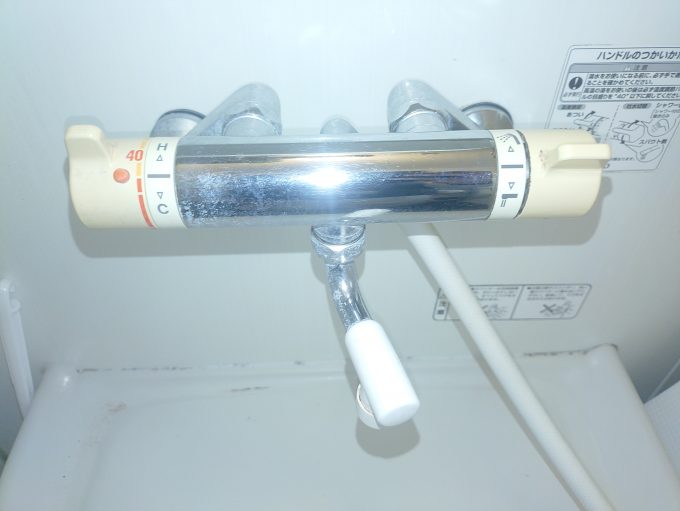 25年ご使用のサーモスタットのレバータイプの浴室水栓でレバーで湯水を止めるのですがレバーがガタガタになっていて『止める』の位置に動かしても勢いよく湯水が出ています。昨日の夜ご使用時に急になったそうでそれから水道メーターのバルブで止めている状態でお客様もお困りのようでした。