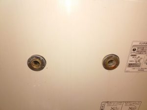 水栓本体を外すとこんな感じで左側がお湯右側からはお水が流れています。これを水栓が温度調整してシャワーやカランに流します。